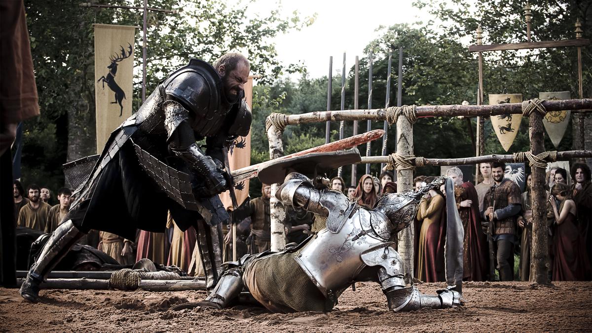 беременная Дейенерис Таргариен и уходит в отставку как рука Роберта, разозлив его. Кейтилин и Тирион (которых она взяла в плен) прибывают в дом ее сестры Лизы в Орлином Гнезде. Весть о пленении Тириона достигает Королевской Гавани, где Джейме Ланнистер, брат-близнец королевы, требует ответов от Неда. Мстительный Джейме сражается со Старком до тех пор, пока его человек не ударяет Неда в ногу сзади, оставляя его раненым, когда его силы покидают столицу.