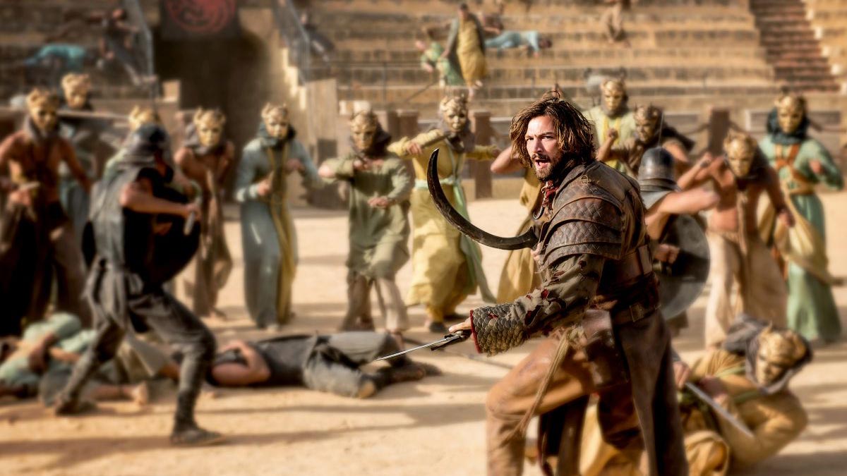 В Браавосе Арья замечает Транта, сопровождающего Мейса, отца Маргери и мастера над монетой. В Миэрине начинаются бои в яме Дазнака, и Дейенерис очень удивляется, когда видет Мормонта среди сражающихся. Его триумф прерывается яростной атакой, организованной Сынами Гарпии, которые достаточно быстро окружают Дейенерис и ее сторонников, включая Мормонта. Как раз в тот момент, когда всякая надежда, казалось бы, потеряна, появляется Дрогон. Бурерожденная садится на него и улетает прочь от ямы, а ее последователи наблюдают за ней с благоговением.